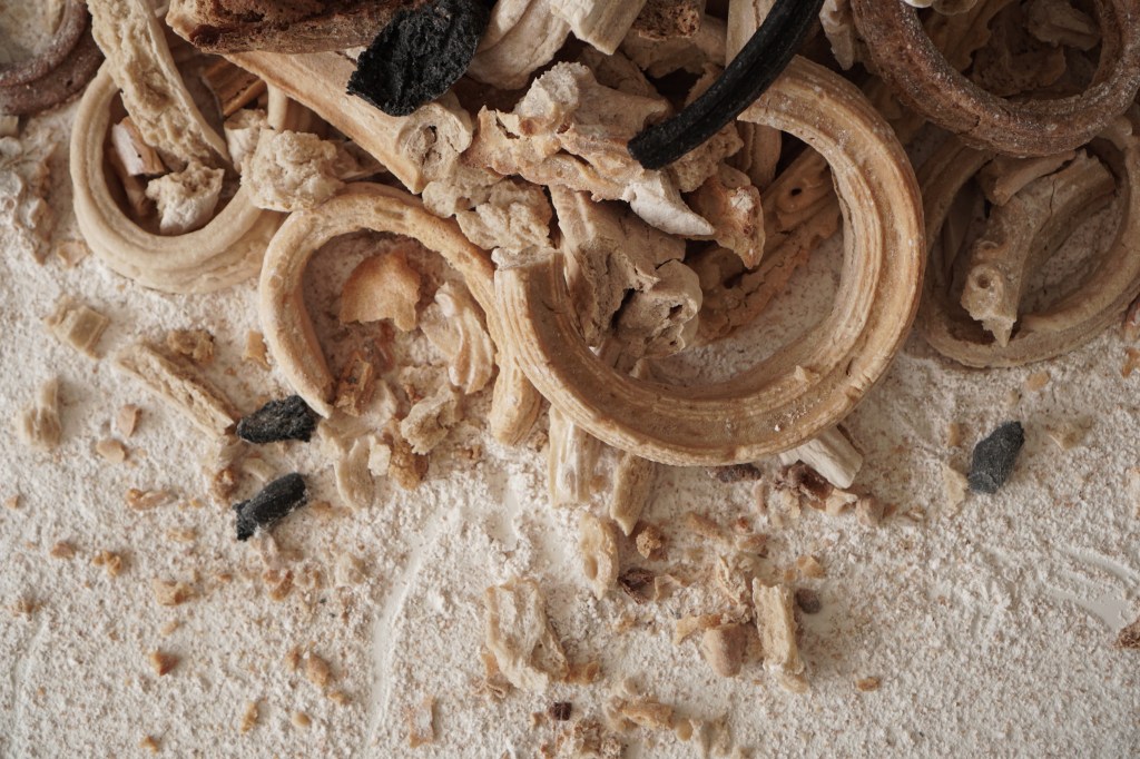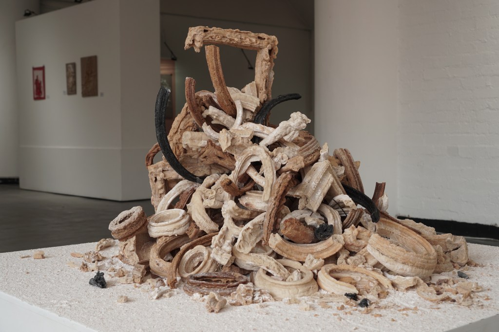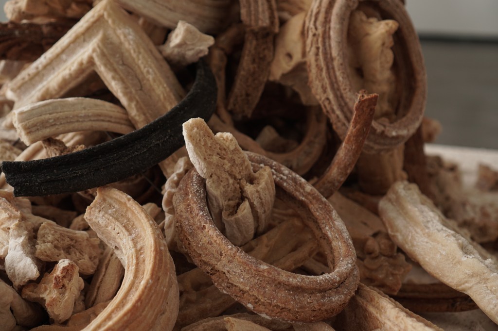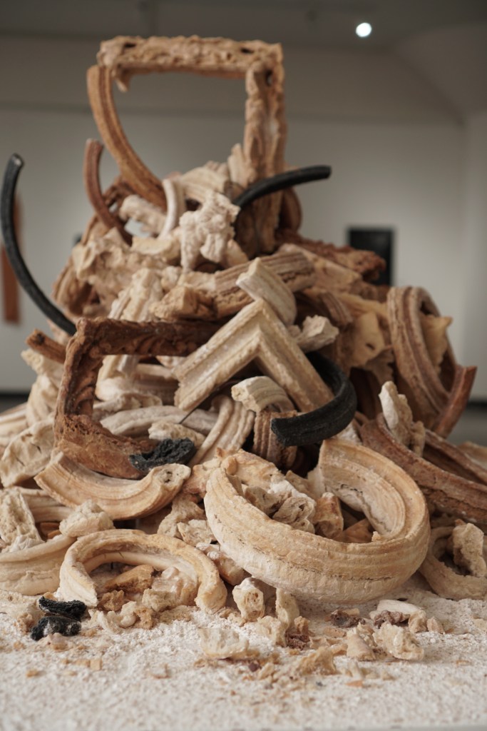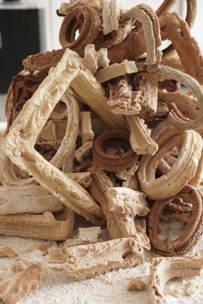 These sculptures are made from shards of broken and stale bread frames that fall to the ground during the course of my “Breaking Bread” installations. It is part of an ongoing series of works titled “Breaking History, Mending Present”. Like stone heaps that hikers in the wilderness add to as a way to mark their passing, these bread piles are a ritual of sorts. They become a way to take stock of Western art history and its colonial legacies; and a way to bring to the forefront of imagination that nothing lasts forever, not even legacies that promise eternal life.