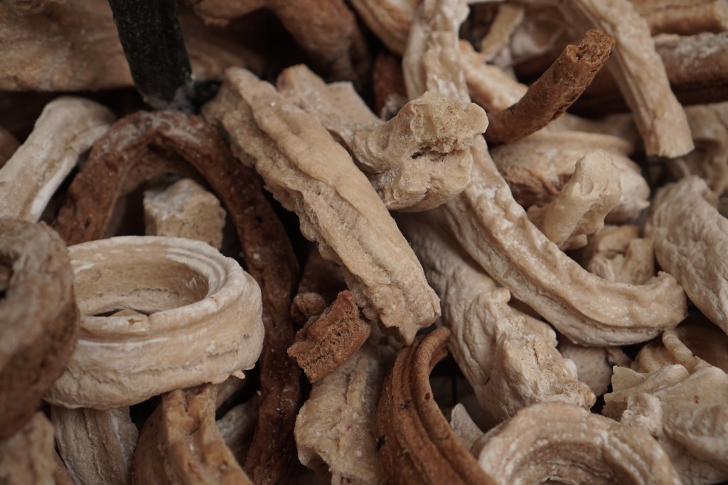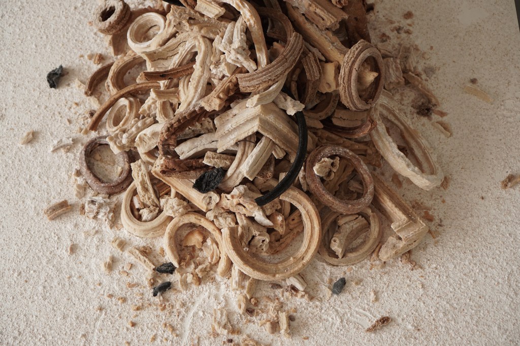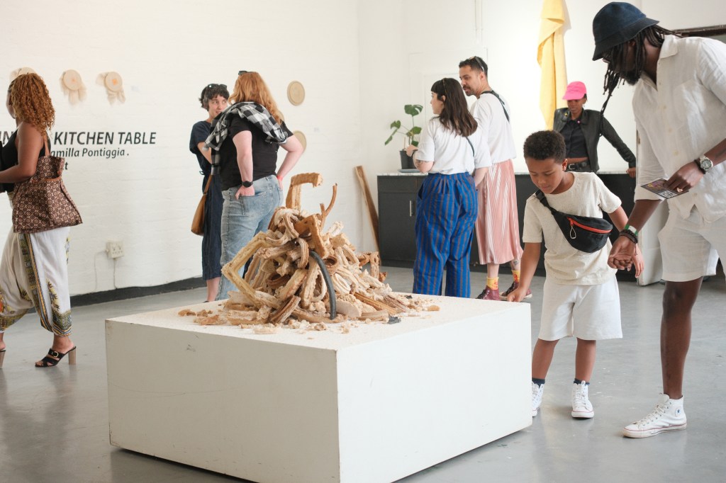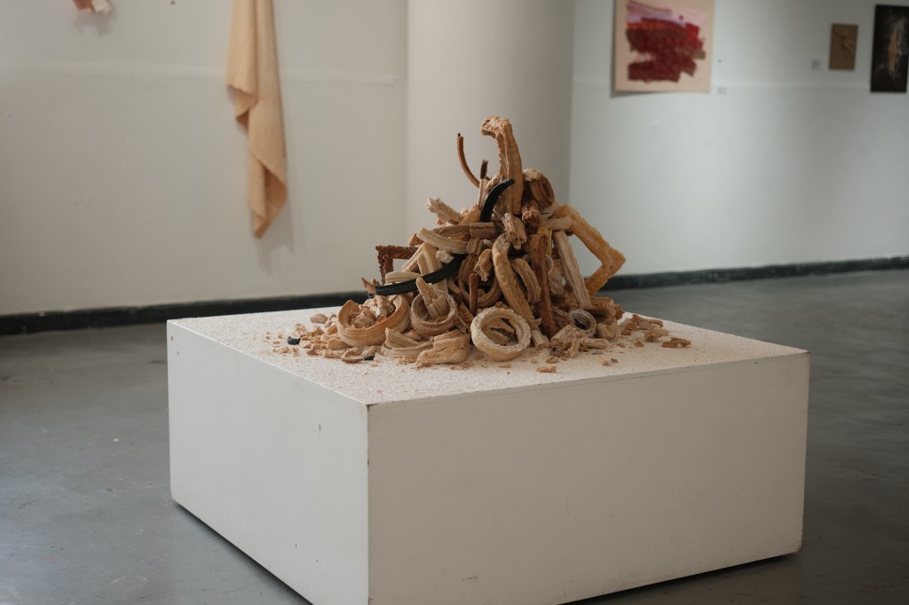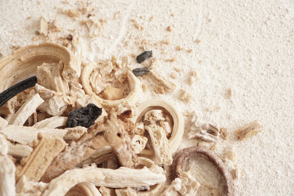 These sculptures are made from shards of broken and stale bread frames that fall to the ground during the course of my “Breaking Bread” installations. It is part of an ongoing series of works titled “Breaking History, Mending Present”. Like stone heaps that hikers in the wilderness add to as a way to mark their passing, these bread piles are a ritual of sorts. They become a way to take stock of Western art history and its colonial legacies; and a way to bring to the forefront of imagination that nothing lasts forever, not even legacies that promise eternal life.