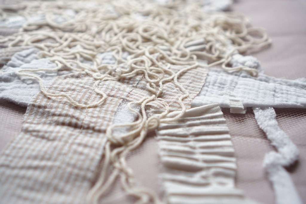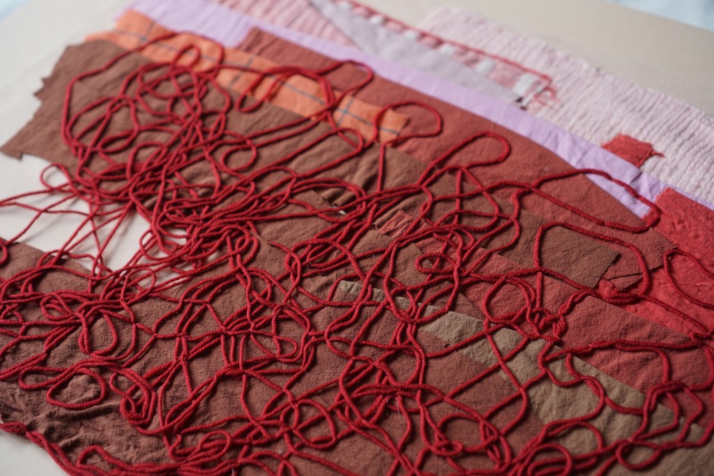 Similarly to kneading dough, there is an element of presence and slow labour to the work of embroidering and mending that becomes for me another way of attuning to aesthesis. These stitched works are attempts towards a reparative act, which I do not think of as one that can ‘fix’ what was previously broken, cast aside, or othered. Rather I think of ‘repair’ as an act of mending, one that evidences the mending done, and in so doing, holds what was and builds on it something new, or, more appropriately, something alternative.