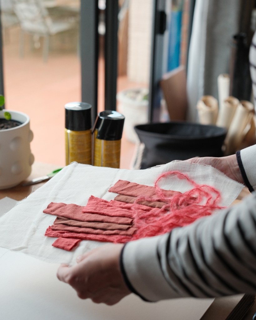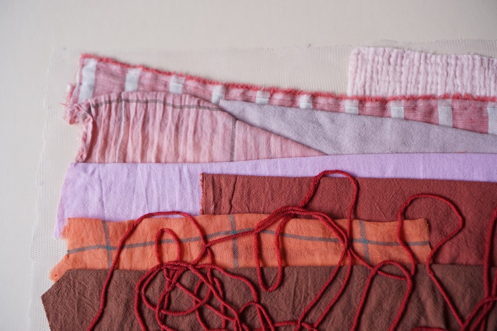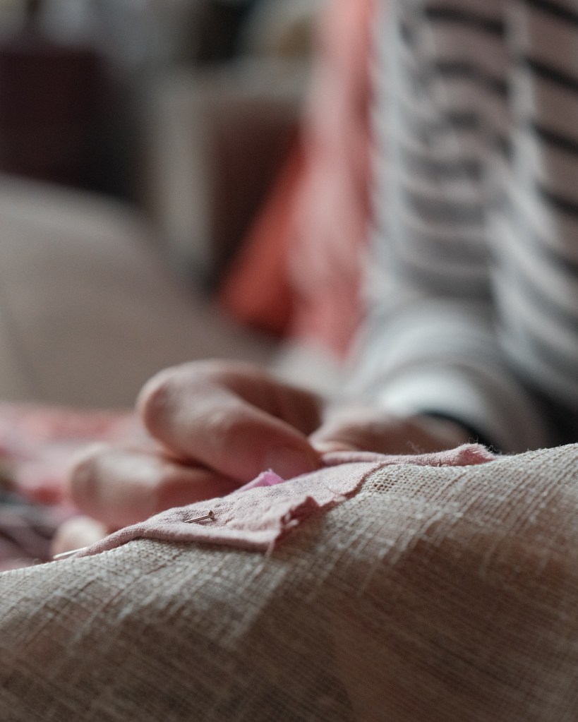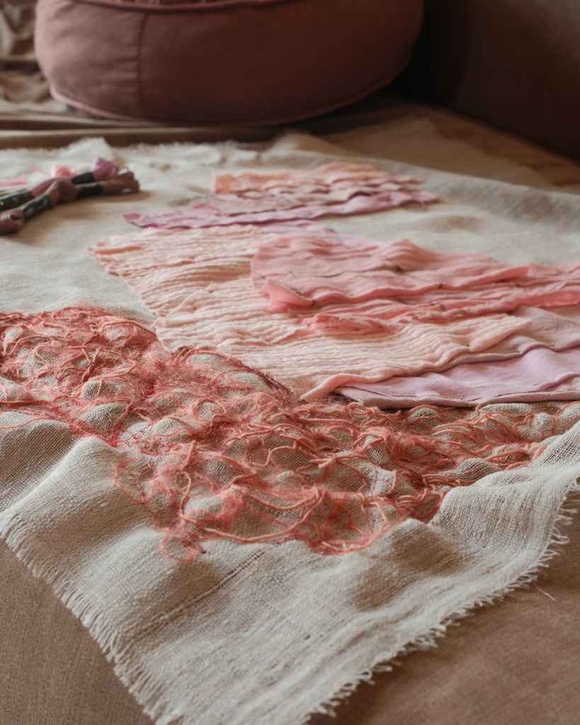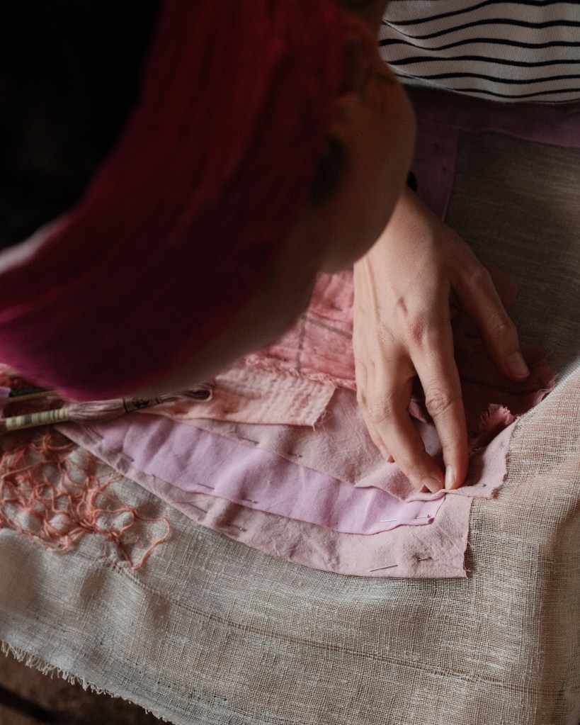 Mending Mother is a series of fabric works that grew out of an earlier work titled Mending God The Mother (2024), in which I added a series of mending stitches to a disfigured portrait of the Madonna and Child. In this new body of work I consider more closely the process of mending as a reparative act of care.