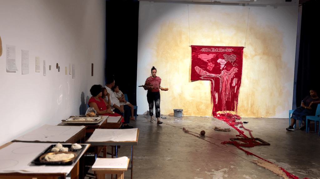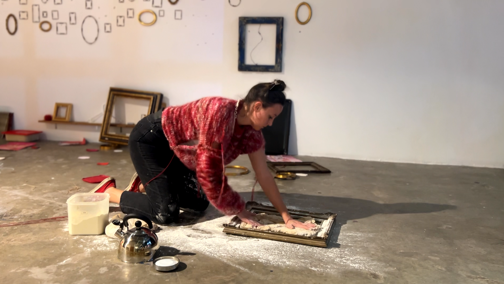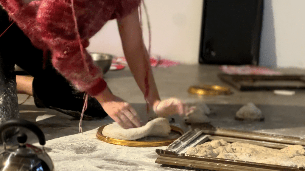 The place where I most felt aesthesis as an everyday practice of sensing was at the kitchen table. It was a place that centered love and communion offered over food. Communion over the kitchen table, food, creativity, and God, all became synonymous with sacred space for me, epitomised by the hours I spent drawing under the table. This very same table made its way into my performance and exhibition. My kitchen table became one of a number of performative gestures in my performance, Things I Found Nelle Viscere, that got me thinking about the creative and reparative importance of communing with others through labours of love such as preparing and serving them food. I began to collect my favourite recipes from family and friends: Zia Enrica’s Ragu’, Nomfundo’s mom’s Magwinya, Michelle’s Green Beans. I made and served all of these recipes as the closing offering of Things I Found Nelle Viscere, inviting the audience to partake in a moment and a meal together. At the start of the performance, the two sides of the installation were separate entities, but by the end they had intermingled. Through a series of performative gestures – taking picture frames off the wall and placing them on the floor; moulding bread dough into the picture frames and placing them on oven trays; placing the trays of dough onto the kitchen tables alongside the final offering of food at the end of the performance – the normative Western aesthetics of gilded pictures frames and oil paintings had been altered by the aesthesis of the kitchen table and family recipes.