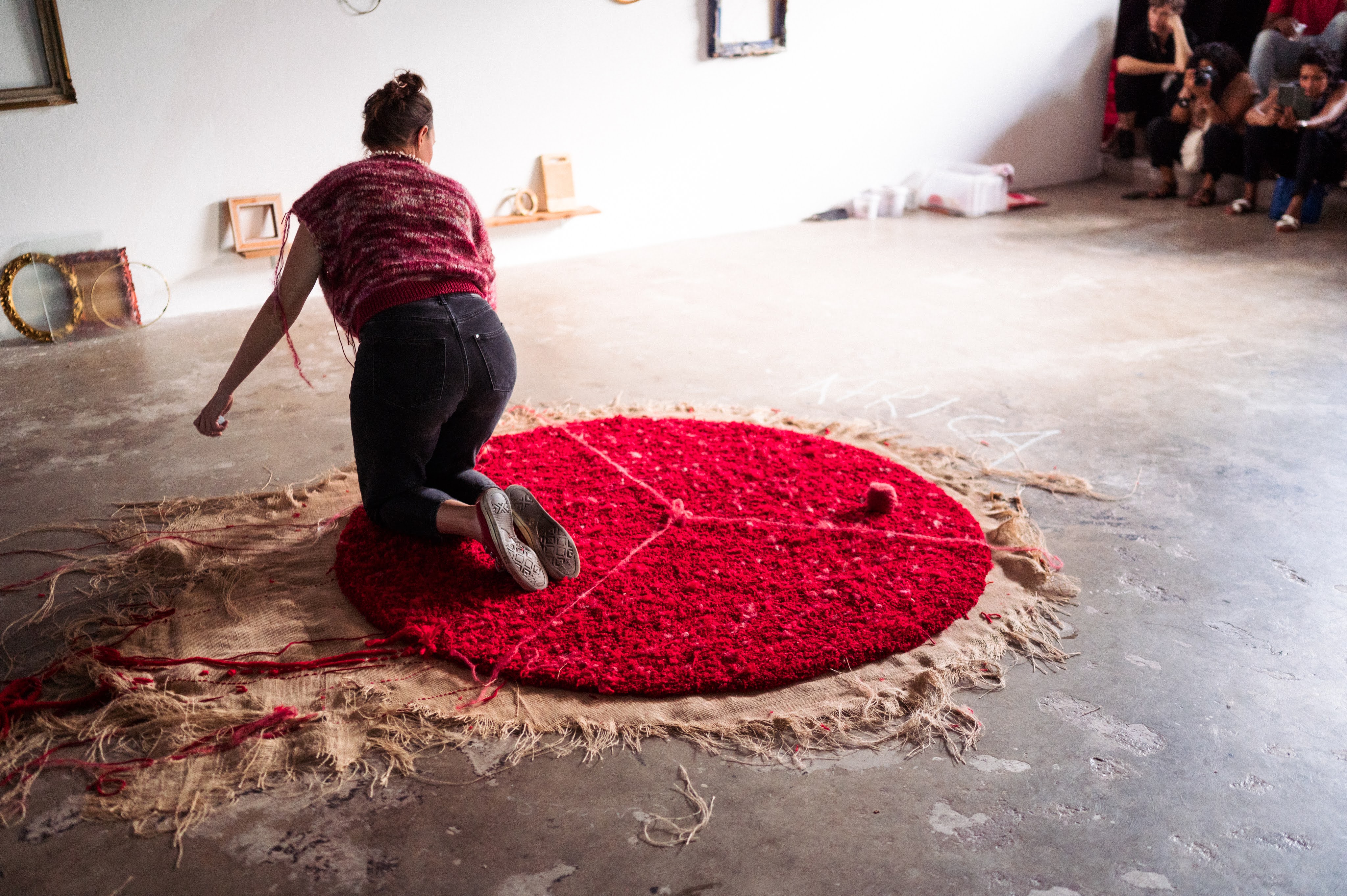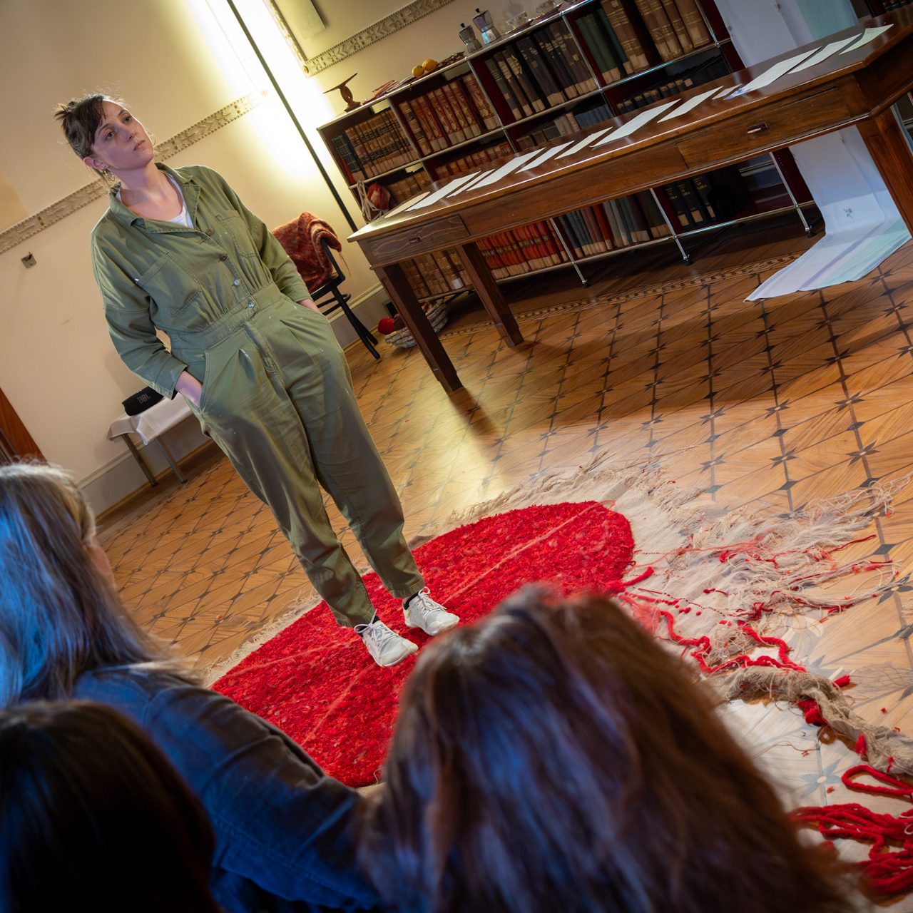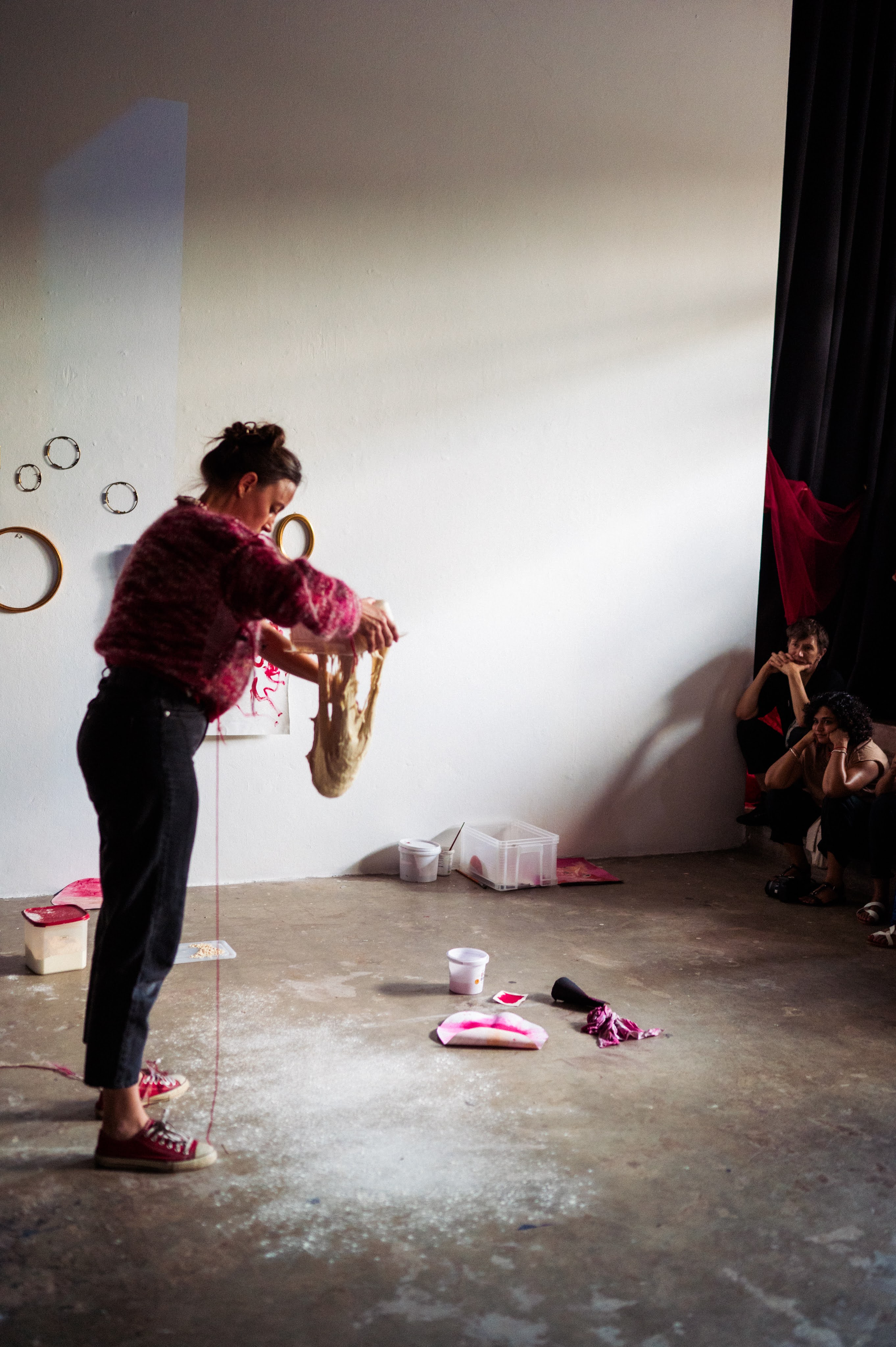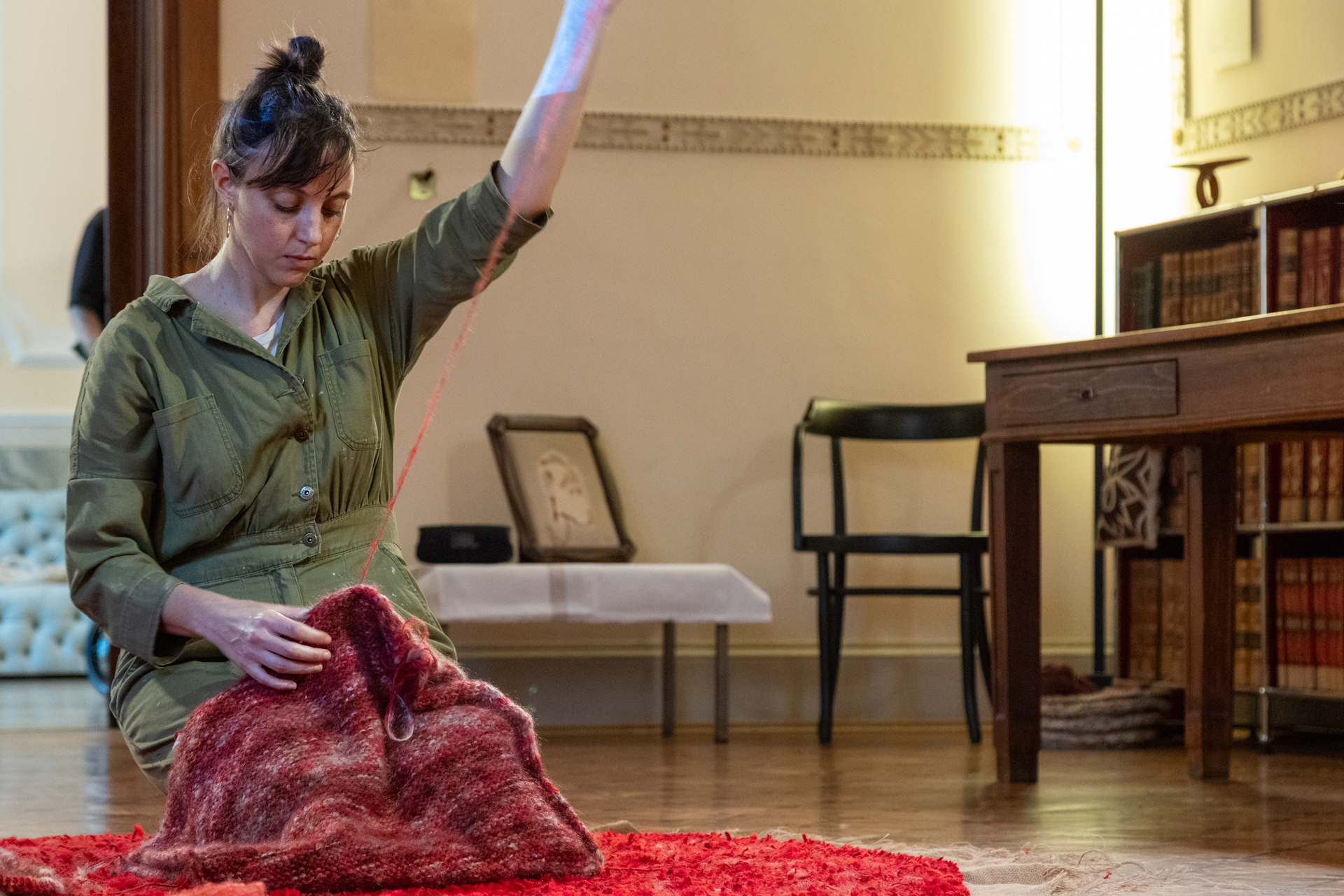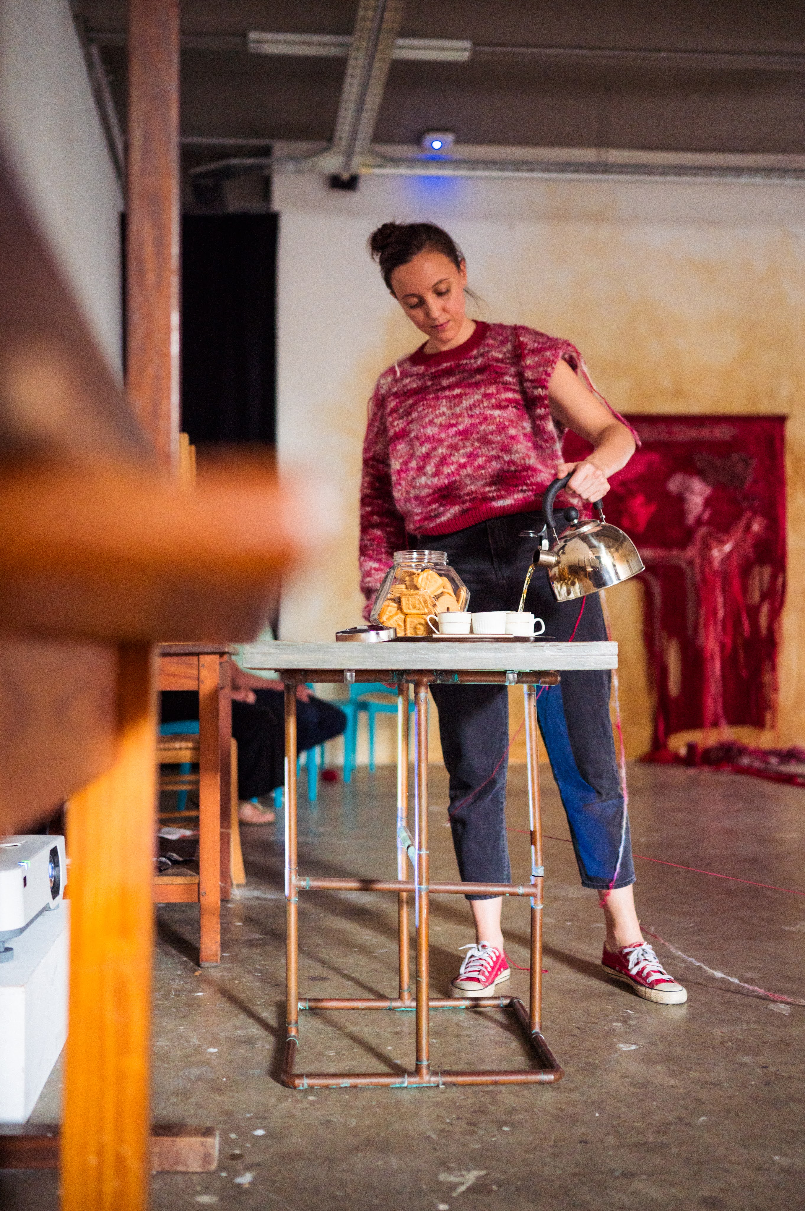 The performance Things I Found Nelle Viscere tells a story about unravelling a colonial history of knowing, being and doing, with a particular focus on unravelling art at the intersection between aesthetics, aesthesis and God. The performance activates the entire exhibition space and the artworks in it. It considers the whole space as a home made up of assorted living rooms, storerooms, corridors and kitchens, all of which are interacted with as the story progresses. This performance invites the audience into the story of this tender albeit fractured home, offering moments to witness, commune and sit-with the work over shared food and stories.